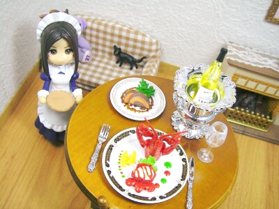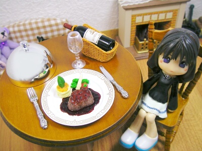 先日、スーパーに行ったら、前々からちょっと欲しいと思っていた食玩『三ツ星レストラン』が売っていたので2箱だけ買ってきました。本日はそのうちの一つを御紹介。フルコースの中でも最もポピュラーな肉料理「牛フィレ肉のロースト」です!肉に合う赤ワイン付き~。料理も良く出来ていますが、食器も細かい所までちゃんと作り込んであります。ワインのカゴもお洒落です。お皿カバー(?)のピカピカ具合も素晴らしい!・・・けど写真に撮ると、カメラ&撮影者まで写り込んでしまうのでちょろっと加工してみました(笑)