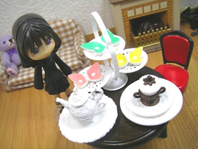朝起きて外を見たら、大雪が降っていたので、ブログのネタにしようと思ったら、夕方には雨に変わり、積もった雪もすべて解けてしまったので、昨日の予告通り食玩紹介いたします(長い前フリ)今日御紹介する食玩は『プリンセスティーパーティ』の「プリンセスのお気に入り」です。内容はケーキスタンド、2段重ねのティーセット、蓋つきカップセット、蝶の小皿の4セット。これは本当にどれもこれも上品でお気に入りですv特に気に入ったのは、ケーキスタンドですね~♪お皿の透かし彫り模様(?)が本当に細かいのです!さっそく以前買った食玩のケーキを乗せてみたら、想像以上に絵になっていて感動しました♪やっぱり食器は淡い色が良いです。ところで、明日・明後日・明々後日と大阪&東京にお出かけなので、更新が一言日記になってしまうと思います。すみません~☆