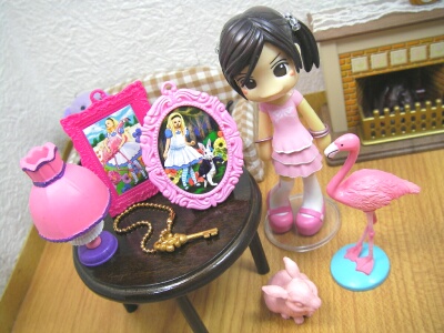 先日、自転車を買った帰りに、久しぶりに行ったスーパーで食玩売り場に行ったら、かなり種類が減っていました。あああ、不景気の波はこんな所にも影響されるのね・・・(涙)その数の少ない中、何とか新商品を発見。『恋するPINK』を一箱だけ買ってきました。わくわくしながら開封してみたら、一番出たらどうしようと思っていた「乙女チック アンティーク」でした(笑)内容は「額縁に入ったアリスの絵」×2「ランプ」「ウサギ」「フラミンゴ」「アンティーク調の鍵」の6点。この中で唯一気に入ったのは、アンティーク調の鍵のみ!あとはどう使おうかと思案にくれています。とりあえずアリスの絵の額縁を塗り替えてみようかなぁ。ランプも、もう少し全体的に色が薄かったらよかったのになぁ。・・・と、ちょっと不満の残るお買い物になってしまいました(苦笑)明日は特に何も無ければ、他の種類の食玩を御紹介します。そっちは欲しい物が出たので、嬉しかったですv