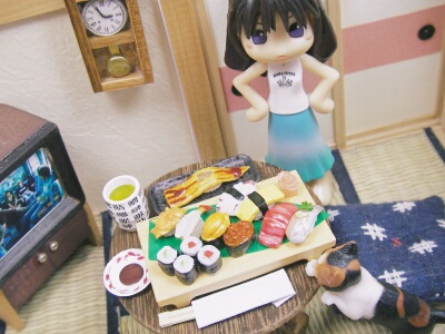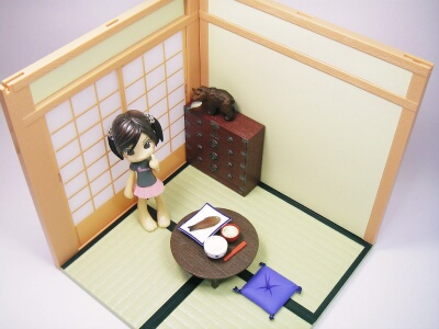 ねんどろいどプレイセットの『和の暮らしA食卓セット』を買ってみました。和室のドールハウスは持っているので、このセットはスルーしていたのですが、付属品の「木彫りの熊」が欲しくて購入を決意したのです。それと、わたしの持っている和室は、室内を撮影する時一々襖を外さなくてはならないのが面倒なので(笑)和室撮影を簡単に撮る時用に、使おうと思ったのです。付属のちゃぶ台、折りたたみ式な所が良いと思いましたがピンキーにはちょっと小さいですね。和食セットも、食玩の方がリアルかも。魚、焦げすぎだしー(笑)タンスは引き出しが開かないので、本当に飾りだけですね~。そんな訳で付属品は、木彫りの熊と座布団のみ使用。部屋は襖が開くので、これを利用して何かネタ写真が撮れたらいいな、と思っています。