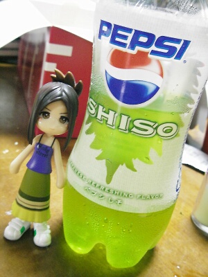 発売されてから、いろんな人の日記で見かけますが自分ではとても買う気になれなかった噂の飲み物。『ペプシしそ味』を、弟が飲んでいたのでさっそく一口味見をさせてもらいました。よく買ってきたな!すごいぞ弟!まずは見た目。写真の通りものすごく鮮やかなエメラルドグリーンですよ。いかにもアメリカ的な色使い!すごい色です~。それから匂いを体験・・・・・・ぐはぁっ!!想像以上の破壊力がっ(笑)しそと何かの薬品を混ぜて炭酸で割ったような感じがするっ!!次にいよいよ味を体験・・・・・・あれ?匂いは強烈だけど味はそんなにひどくは無い。それどころか、ちょっと爽やか風味ですよ(笑)とりあえず匂いに慣れれば、普通に飲めるかも。正直拍子抜けでしたが、やっぱり自分では買う気になれないジュースでした。以上!!さて、明日はお休みをもらって後楽園に行ってきます。・・・と、言ってもヒーローと握手してくる訳ではなく、RAGとINSPiのシャッフルライブを見に行くのです。何か面白いものを見かけたら、ネタにしますね~(笑)