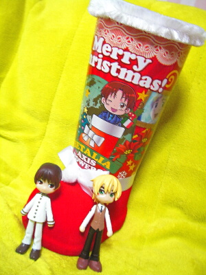 朝起きたら、こんなクリスマスブーツが枕元に置いてありました!・・・・・・嘘です。これは今日、家に帰る途中、地元のアニメイトに予約していたヘタリアDVD6巻を取りに行ったついでに買ったものです。昨年販売された物らしくて、50パーセント値引きされていたので、つい手を伸ばしてしまいました(笑)ちなみにブーツの中身は、板チョコ、クッキー、キャラメルポップコーン、チャームでした。クッキーはごく普通の形だったので、夕食時に家族に配ってしまいました。なので、ここには写っていません。とりあえず今日は見るだけ。開封して面白かったらまた後日中身を紹介しまっす。実は今日、某猫カフェに寄ってきたのですがその事は明日書こうと思います。