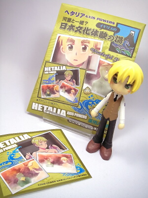 先日買ったヘタリアグッズシリーズ。何とこんな物までありました。『イギリスの日本文化体験の湯』これだけだと意味不明ですが、俗に言う入浴剤です(笑)種類はにごり湯、2袋入り。そしてオマケにイギリスの浴衣脱衣シーンと河童との入浴シーン画像のシール付きです。何このサービス、意味わかんない!(笑)つか、日本文化なら日本の画像も一枚くらい入れて欲しかったなぁ(ぼそり)それにしても、こんな商品まで作っちゃうとは本当に洒落がわかるというか、商売上手というか・・・(笑)まぁ、入浴剤は普通に使えるので迷わず購入しました。今度ホテルに泊まる時に使ってみようと思います。話は変わりますが、来年3月に大宮でアニメのヘタリアイベントがあるそうですね。うわ、色んな意味ですっごく気になるんですけど!