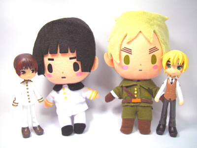 予約していたヘタリア6巻DVDを取りにいくついでに、買った物その2(笑)販売直後、即行売り切れになっていたヘタキャラぬいぐるみですよー!本当は全種類欲しかったのですが、ちょっと我慢して、好きキャラベスト1&2のこの二人を買ってきました。竹林で写真を見た時も可愛いと思いましたが実物はもっと可愛かったですー♪日丸屋さんのチビキャラ絵が、そのまんま立体化されていて、感動しました。眺めていると、ほっこり和みます。ああ、可愛い♪この写真ではむき出しになっていますがケースデザインも可愛いし、埃防止の為にそれに入れたまま飾っています。ケースも撮りたかったけど、光が反射してうまく写すことが出来ませんでした(汗)置く場所を確保できたら、他のキャラも集めたいなぁ・・・。竹林では、ロシアのクリスマス(1月7日)までリクエスト絵を募集しているようですね。個人的にうさ耳な伊独日と、英と日のお弁当おすそ分けな絵で、おなかいっぱいです(笑)ありがとう、ひまさん!