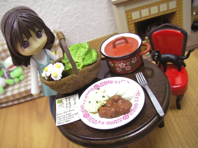 そういえば先日買った食玩、まだ紹介をしてなかったのを思い出しました(笑)ちょっと前に一箱買いましたが、もう一箱買ってみました。『ヨーロッパのおばあちゃん自慢のお料理』今回出たのは「ビーフの煮込みとキャベツの酢漬け」チェコのおばあちゃん料理だそうです。可愛いお鍋が付いてきましたが、中身は空っぽです。てっきりビーフの煮込みが入っているとばかり思っていたので、ちょっと意外でした。個人的に酢が苦手なので(小さい頃、無理やり飲まされてトラウマになった)この料理はあまり嬉しくなかったり(笑)でも、籠に入ったキャベツとお花はお気に入りです♪