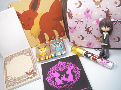 昨日買って来たイーブイコレクションを一部晒してみます。まずはトラベルポーチ、メモ帳、ノート、ロケット消しゴム、ミラー、プチ缶。ポケモンキャンバスイーブイぬいぐるみ、ミニトートバッグ、チョコマシュマロ。この他に写真で収められませんでしたがイーブイとエーフィのクリアファイルも買いました!これでも厳選したのですが、家に帰って冷静に考えてみると、やっぱりアレやコレも買ってくれば良かったという物がいくつかあるのですよ・・・。そんな訳で、今月中にまたポケモンセンターに行って来ようと思います(笑)本当に呆れる位イーブイ好きだな、自分!!