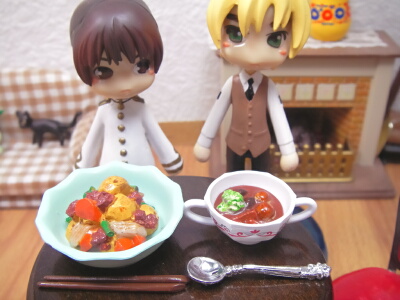 先日紹介した食玩のビーフシチュー。この写真を撮りたかったので、わざわざ取り寄せたのでした!↓知っている人は知っていますが、日本料理の肉じゃがの元は、イギリス料理のビーフシチューなのですよ。・・・で、ヘタリアでその話をネタにしていて、たまたま手元に食玩の肉じゃがを持っていたのでもし、ビーフシチューの食玩を見かけたら絶対買おうと思っていた矢先に、現物を楽天で見つけたので、買ってしまった訳です。微妙に肉じゃがの方が大きいのですが、そこはまぁ、仕方無いとして(笑)ものすごく満足です♪今更ですが、ヘタリアのアニメ第3期配信が決定したそうですね。と、なるとあの同盟の詳細話や猫と一緒の日本語教室(?)の話なども、やってくれる可能性が高くなった訳で・・・!!うわー、ちょっと期待しちゃいます。