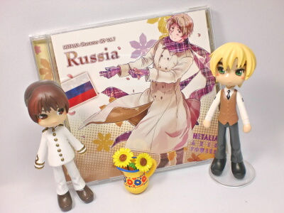 Amazonさんで予約していたロシアさんのキャラクターCDがフライングで届きました♪ネタバレしない程度に感想を箇条書きしてみます。「зима」 ・想像以上のロックミュージックでカッコいい! ・今までのヘタリアキャラ曲の中で、歌詞がまとも!(笑) ・でもロシア語の意味がわかりません。後で調べてみよう。「ペチカ~ココロ灯して~」 ・サウンドも歌声もめちゃくちゃ可愛い! ・だけど、歌詞が恐ロシア。 ・うふふっ♪ver.って・・・(笑)「ミニドラマ」 ・妹に怯えるロシアさん、ちょっと可愛いかも。 ・ベラルーシ、可愛・・・こ、怖いぃぃ(涙) ・ウクライナさんの効果音が素晴らしいです。ばいーん! ・日本さんの出番が多くてめちゃくちゃ嬉しいんですけど! ・つか、恥ずかしがる日本さん、めちゃくちゃ可愛いんですけど! ・ぽちくん連れて来ているんですか?(笑) ・日本さんとイギリスさんの会話に滾る・・・! ・ウクライナさん・・・可愛い(笑) ・やっぱり存在感が無いカナダさん。頑張れー! ・でも、一番存在感が無かったのは会議主催国の・・・(涙) ・よくぞここまであのG8漫画をここまで広げてくれました。個人的に、日本さん関係の事をめちゃくちゃ語りたいのですが軽く1000文字は超えそうなので、自重しておきます。・・・やっぱりヘタリア専用語りブログ、始めるべきかなぁ?
