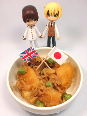 本日は日本さんとイギリスさんが友達になった日、という事で肉じゃがを作ってみました(笑)ジャガイモと玉ねぎは、家にごろごろあるのですが(農家だしー)シラタキとグリーンピースと肉はなかったので、わざわざ買いに行きました。シラタキは細めのがよかったのですが、細いのは鍋用の結んである物しかなかったので、普通の太さを購入。肉はいつもは豚肉ですが今日は特別に牛肉、しかも国産。他の国の肉や豚肉では意味が無いのですよ。この辺は徹底的に拘らないと!(こぶしぎゅ)ちょっと煮込みすぎて、ジャガイモの形が崩れたり、ニンジンを入れ忘れたりしてしまいましたが、味は大好評でした。ただ、牛肉を使った事に疑問を持たれてしまったので、その辺は適当にごまかしましたけどね(笑)・・・で、買い物に行く途中、本屋に寄ってヘタリアアニメの絵コンテ集3を買いました。本来は買うつもりはなかったのですが、今回の表紙が日本さんとイギリスさんのコンビなんですよー。見事にゲイツされました。この商売上手っ!それにしてもこの眉毛紳士、大変良い表情をしていますな。ちなみに裏表紙は・・・↓(笑)