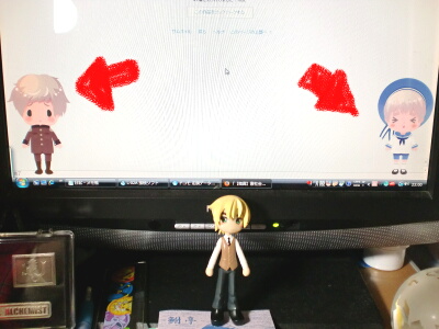 キタユメ。さんで配布されているデスクトップマスコットのシーランド君とラトビアちゃんの最新版をダウンロードしてみました。以前、旧バージョンを入れたはずなのに、見付からなかったのは前のPCに入れていたからという事に気付いたので、改めて初心者用をゲットです。せっかくだから、他の所で配布されている伺か用ゴーストも入れてみようかなぁ。久々にシー君とラトビアをデスクトップに配置させて、二人の会話を見ているのですが、雑学がさらに増えていて面白いです。しかも登場キャラ増えてるし!確かプロイセン、スペイン親分、ロシアさん、そして日本さんは前回出てこなかった・・・ですよね?個人的に日本さんが出てくるとは思わなかったので、出現した瞬間、1人で大興奮してしまいました!風に吹かれていて、格好良い!でも、シー君との会話内容はヲタク話・・・(笑)そんな祖国が大好きですv