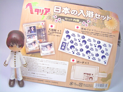 ちょっと遅くなりましたが、先日またもやヘタリア関係のグッズを衝動買いしてしまいました。その商品とは『日本の入浴セット』ビニールポーチの中に、入浴剤と手ぬぐいがセットになっている物です。「日本の」と、ついているだけあってどれも日本が描かれています。以前、イギリスの日本文化体験の湯の事を書いた時に「日本も出せ!」と、つぶやいていたら、願いが叶ってしまいました(笑)で、入浴剤の中にはイギリスと同じくシールがオマケについていたのですがそのシールの画像が日本の流し目入浴シーンなのですよ。何て嬉し・・・ゴホン、破廉恥なサービス!そして手ぬぐいは可愛すぎて、色んな意味で使う事ができません(笑)ポーチはお風呂屋さんとか、温泉に行く時に普通に使おうと思っています。しかしアニメイトに行く度に、面白グッズが出ているので、ついついゲイツされてしまいます。まぁ、楽しいから良いよね!