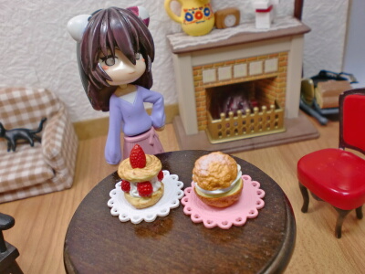 久しぶりに近所のドラッグストアに行ったら、リーメントのぷちサンプルシリーズ「ケーキ屋さん」と、いうのを見つけたので、3つほど買ってきました。箱ではなく、袋入りは割と安値だし余計な物も付属していないので良いですね~♪もっとこのシリーズ、出して欲しいです!・・・で、今回出たのは「シュークリーム」でした。オーソドックスなカスタード&生クリームタイプと、生クリーム&イチゴタイプのふたつ。ピンキーよりちょっと大きめですが、まぁ、許容範囲だと思います。細かいところもよく出来ていておいしそうですが、欲を言えばもうちょっと、ダブルクリームの方の粉砂糖を多くして欲しかったなー・・・。後の2個はまた後日~。