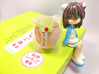 先日仙台に行った時に、新幹線の中で買った仙台土産『仙台いちご日和』というお菓子を食べました(遅っ)形はまあるい苺を模っていて、表面にイチゴチョコのコーティングがされています。そして上部に苺のヘタ型の緑色のチョコレートが乗っかっているのですが、それがまた可愛い!中は白餡の中にイチゴソースが入っていて鮮やかです。肝心の味ですが、すっごく甘いです。お茶が無いとちょっと辛いかも…(笑)でも、そのお茶と一緒に頂くと大変美味しいので、いつもは萩の月を強請る母に、また買ってきてと言われました。これを買った時、このお菓子は『かもめのたまご』と同じ会社で作られたとお友達から教えられたのですが、改めて納得しました。あれもお茶が無いと食べられませんからね!箱もイチゴの赤と緑という色使いで、すごく可愛いのでピンキーのパーツ入れにしようと思います♪