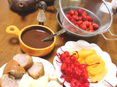 バレンタインで買ったまま放置していたチョコレートフォンデュを、おやつの時間に母と食べました(どうでも良い事ですが、このチョコはスイス製です)用意したのは、バナナ・イチゴ・パン、そしてサクランボと黄桃の缶詰。二人分にしてはちょっと多かったかも・・・。それでも何とか全部食べられましたが、チョコレートは1/3ほど残ってしまいました。もったいないなぁ。でも、一度溶かして固まったチョコを、もう一度溶かすと確実に味が落ちるので、泣く泣く諦める事にします。ごめんなさいっ!