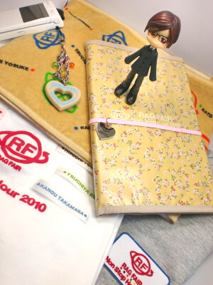 今回のRAG FAIRライブNSHのグッズ、今更ですがようやくじっくり見る事ができたので、ちょろっと感想を書いてみたいと思います。・パンフレット→小花模様のブックカバーがすっごく可愛いです!本文に使用されている紙ですが、パンフレットの厚みなので手帳として本格的に使うと、少々使いにくいような気がします。・Tシャツ→白を買いました。メンバーの名前がタグに書かれています。シンプルなので、インナーとしてちょうど良いかも。・パーカー→実は今回一番欲しかったアイテム。普通に可愛い!横浜公演で売れ切れていた時は、地味にショックを受けました(笑)・携帯ストラップ→正直可愛すぎます!せめてハート部分をふた回り小さく、もしくは☆マークにして欲しかったなぁ(汗)着けますけど!・タオル→濃いベージュはちょっと意外ですが、結構好みかも。デザインも可愛い!!…と、こんな感じです。個人的にパンフレットが小さくて、すごく助かりました(笑)写真が小さくなってしまうのは残念ですが大きすぎるよりは良いかと思われ。