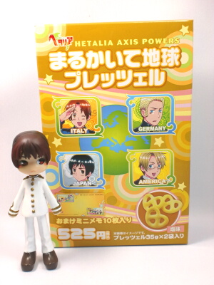 先日買ったヘタグッズ新商品『まるかいて地球プレッツェル』です。パッケージ表面が伊・独・日・米の組み合わせに一瞬疑問が湧きましたが、側面に他の面子もちゃんといたので安心しました(笑)オマケとして、ミニメモ10枚が入っていたのですが、想像より小さくてびっくりしました。しかも日本さんと中国さんの足が切れているし!まぁ、オマケ目当てという訳ではないので、別に良いのですが。……うん、ネタに出来たからいいんだー(しょんぼり)あ、プレッツェルは普通においしかったです♪2袋に分けてあったのは、大変ありがたいですねー☆