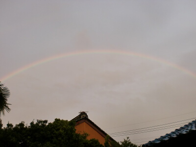 仕事帰り、駅から家に向かう途中、小雨が降り出してきました。あと5分待ってくれればぬれずに済んだのに!と、思いつつふと、空を見たら虹が出ていました。しかもその虹は今まで見た事が無い大きさでした!家に帰って、急いでデジカメを部屋から持ち出して撮ってみたのですが、フレームに収まり切れない程大きかった為とりあえず虹の根元と真ん中を写しておきました。あまりカメラには綺麗に残せなかったけど、記憶にしっかり焼き付けておく事にします。この虹に気付かない人もいるんだろうな、と、ちょっとだけ優越感(笑)こういう事があると、雨も良いなぁ…と思えますね♪