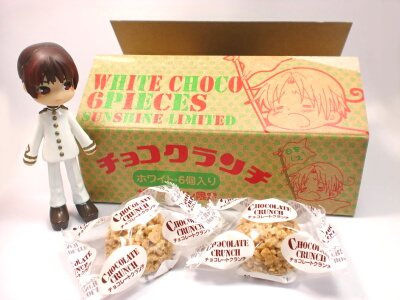 先日池袋に行った時に、サンシャイン60限定販売の銀幕ヘタリアチョコクランチを買ってみました。そこで1000円以上のヘタリアグッズを買うと、記念品にミニクリアファイルがもらえるというので、ついつい…(笑)「白くぬれ!」という映画のタイトルに沿って、中身はホワイトチョコクランチでした。ダジャレ!6個入りでちょっと少なめですが、結構美味しかったです。チョコクランチのサクサク感が堪らない♪一つ一つがちょっと大きめなので、小腹が空いた時のおやつとしては十分だと思います。外見は、段ボール箱を模した感じです。ガムテープでワイルドに封印されていました(笑)イタちゃんの絵とかデザイン的にも可愛いので、お土産にいいかもしれません。もらえるクリアファイルの絵柄は、6月6日から変わるのでまた行って来ようと思います。この商売上手めっ!(笑)