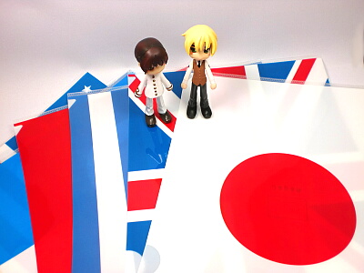 正確にはヘタリアグッズではないのですが、一応関係はあるという事で(笑)竹林で紹介されていた、プロイセンボールペンを辿っていったら、国旗クリアファイルセットという素敵アイテムにたどり着いたので、思わず買ってしまいました。クリアファイルなら普通に使えるし、いくらあっても困らないですからね。しかし組み合わせがあまりにも秀悦すぎて、完全に狙っている感が否めませんね。私が買ったのはイギリス&日本&フランス&アメリカとギリシャ&トルコ&スェーデン&フィンランドのセット。イタリア&ドイツ&プロイセン&スペインのセットもありましたが、それは残念ながら売り切れだったので諦めました。でもどこかで見かけたら買うでしょうね~これだったら会社に持っていっても大丈夫!…ですが汚すのもったいないので、家用にしておきます(笑)