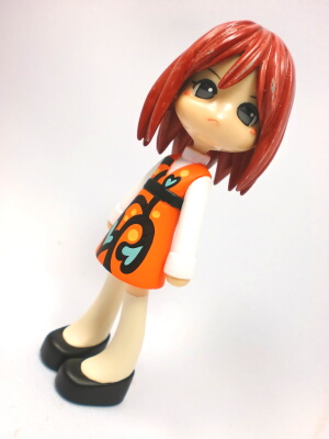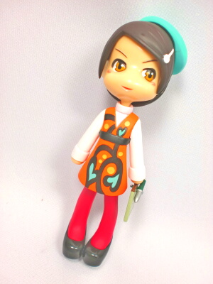 ちょっとレトロなデザインのワンピースと、ベレー帽の昭和ちっくな組み合わせ。個人的にはわりと好きな感じです。ベレー帽を外すと、付属の髪の毛を取り付ける為のちょっと大き目の穴が開いています。サイドで結ぶのも可愛いですよね!付属品はスケッチブックとキャップつきの鉛筆。スケブには表面に穴が開いていて、鉛筆を差し込んで固定する事が可能。もちろん手にも持たせられるけど、小さいので私はスケブに取り付けたままにしておこうと思います。しかし、小物を固定しているセロハンテープのベタベタがなかなか取れないのですが、どうしたら良いのやら。下手に接着剤落しや、除光液を使うと色が落ちてしまいますからねぇ(汗)