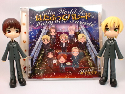 アニメヘタリアの新エンディング『はたふってパレード』のシングルが到着しました。ジャケットが異様にキラキラしていて、パレードな雰囲気は一切ありません(笑)どちらかというと、何のパーティー会場という感じです。そして裏を返すと、何故かイタリアンレストランな雰囲気…いいのかそれで?!個人的には島国二人がすぐそばに並んでいるという事が嬉しくてたまりません(笑)この歌も旧EDと同じく、各国ver.で歌われるという事で…。こんな可愛らしい歌が、どういう風にアレンジされるのかとっても楽しみです♪そしてやはり一番楽しみなのは、島国ふた(以下略)そんな訳で、第3期アニメDVDも初回特典ver.を買わなくてはならなくなってしまいましたよ(苦笑)まぁ、アニメイト特典ver.でないだけ、良いのかも~。で、2曲目の『悪魔をよびそうなイギリスのうた』まさか、この歌の完全ver.が出来るとは思ってもいませんでしたよ!想像していたより、不気味感が無かったのでホッとした様な、残念なような。一回聞いただけだと、iPodに入れて何度も聞きたくなるような曲ではないのですが、ハマると頭の中をグルグル回りそうでちょっと恐いです(笑)正に呪いの歌!!