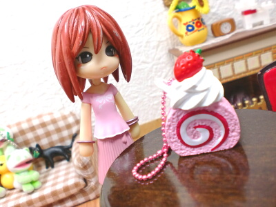 リーメントのぷちシリーズ、キャラクター物ではない新作が出ていたのでひとつ買ってみました。出たのは「ピンクロールケーキ」ロールケーキにたっぷりの生クリームが搾り出されていて、更にイチゴが乗っています。可愛いのですが、どことなくリアルティに欠けているのはイチゴがいかにも作り物っぽいからでしょうか(汗)昔懐かしいバタークリームの上に乗っかっていた、やたら甘いゼリーで作られた真っ赤な偽物イチゴっぽい感じがします(笑)ロールケーキに挟んである、赤すぎるイチゴソースも原因の一つなんでしょうね~。何か、色々残念でした。しょんぼり。