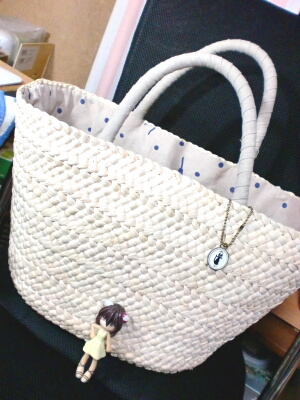 先日ナンジャタウンに行った時、どんぐり共和国の前を通り掛かって見つけてしまい、つい衝動買いしてしまいました。常日頃、ちょっと大きめなシンプルなかごバッグが欲しいと思っていた矢先に、目に飛び込んで来たものですから、これはもう運命だと思ったのです(笑)形もそうですが、中の布にさり気なく魔女の宅急便のジジがプリントされているのもお気に入りの一つ。よく見ると肉球も描かれているのですよ。可愛過ぎます!ジジのチャームも付いていますが、コサージュなどを付けてデコレーションしてもいいですよね♪そんな訳で、この夏はこのバッグを相棒にしてお出かけしようと思います。