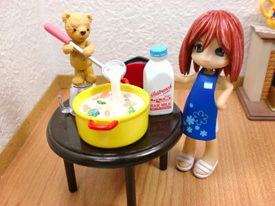 久しぶりにキャラ物ではない食玩を見かけたので、試しに一箱買ってきました。「テディがお手伝い」というタイトルそのまま、テディベアが家事やらお菓子作りやらを、手伝いという名の邪魔しているシチュエーション(笑)私が今回引き当てたのは7番の『味見してあげるー♪』でした。クリームシチュー作りをお手伝いしているもので、ちょっと欲しかったものが出て嬉しかったです♪テディはもうちょっと顔が横に長い方が好みですが、なかなか可愛いらしいです。シチューは具のニンジン、ブロッコリー、ジャガイモ、肉の浮かび具合がリアルで気に入ってます。そしてテディが踏み台にしている計量カップの絵柄が可愛い♪しかし、鍋の色が鮮やか過ぎですね(笑)焦げ付いたらすごく目立ちそう!