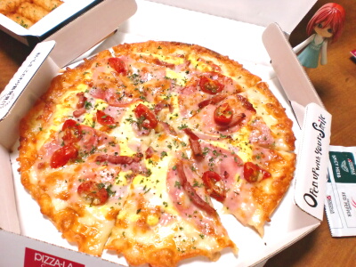 ちょっとお行儀が悪いのですが、私は歯を磨く時に新聞を読む習慣があります。今日もその習慣で、歯ブラシを銜えながら居間に置いてあった新聞を手に取ったら、何とその下には体長25センチ程のムカデが!!思わず悲鳴を上げて飛び退ったら、近くでテレビを見ていた母が台所の片隅に常備してある火バサミを持ってきて、奴をギュッとつまんで、庭の用水路にポイっとしてくれました。お母さま!!ありがとう(感涙)虫にはそんなに恐怖は感じないのですが、ムカデだけはもうどうにもダメなんですよね。一人の時は、ギャーギャー言いながら殺虫剤を吹き付けるだけで精一杯…(汗)しかし、あんな悲鳴上げたのは、空ちゃんが部屋に蝙蝠を銜えて持ってきた時以来ですわー。さすがにムカデを写真に撮るのは嫌だったので、今日の晩御飯のピザーラでも載っけておきます(笑)