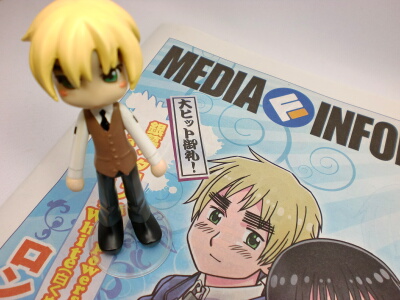 アニメのヘタリアで、ようやく大好きな島国同盟の話が配信されました!いやもう、本当に色々感想はあるのですが、それは別の所に書くとして…原作には無い、ちょっと気になった所を主張してみます。イギリスさんの部下(?)、眉毛立派過ぎ!!…はっ!そういえば香港くんも、イギリスさんに占領されて眉毛が立派になってました。鋼錬のアームストロング家に仕える執事やメイドに、髪の「くるん」が伝染していましたが、どうやら同じ原理のようですね(笑)ちょこっとお知らせですが、本日ひっそりとヘタリアの携帯サイトを開設しましたー。ぴくしぶで描いたヘタリアイラストとか、萌え日記(笑)などがあります。思いっきり自己満足サイトなので、本当にこっそりと運営。なので、あえてアドレスは伏せます。某ランキングには登録したので、もしうっかり見つけたら、こっそり覗いてみて下さい。(←不親切)そんな訳で、これからこちらでヘタリア語りをする事は減ると思います。せいぜい、CD買ったよ、DVD買ったよ、面白グッズ(笑)買ったよ、という報告位になるでしょう。何にせよ、これからは日常記事が多くなりますのでヘタリア記事に興味の無い人はご安心を~(笑)