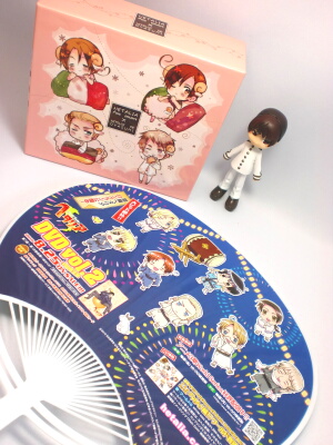 いよいよ明日から、毎年恒例の夏祭典が始まります。今のところ、私が行くのは明日のみです~。そして地獄の企業ブースに行く予定ですが、今回はヘタリア目当てではありません。十数年間、秘かに憧れていた、Kさんに会いに行くのです(笑)まさか今回、企業ブースに出展するとは思わなかったなぁ。直接お話は出来ないだろうけど、遠くからそっとお顔を拝見するだけで十分なので、そんなに早くには行かないと思います。ヘタリアは今回、学ヘタ制服を着た人がうちわを配布するらしいですね。そちらの方をついでに見てこようかな。ヘタリアといえば、ご本家でギリシャさんとトルコさんの紹介文に、改めてドキドキしてしまいました(笑)特にギリシャさんの日本に対する「ここにいる」というのは、どう受け止めたらいいんでしょうね~。トルコさんはストレートすぎて、こっちが照れます。そしてワンコインフィギュア第2弾。11月発売だというのに、予約してしまいましたよ。だってギリシャさんがいるんですもの。ちゃんと猫も付いているのが細かすぎます!写真は本文とはあまり関係の無い、以前買ったフラッグマグの箱。アップし損ねていたので載せてみる。
