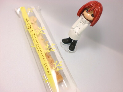 今回も地震前ネタです。すみません!それにしても、今日は計画停電が無くなって助かりました。6時20分から停電されると、本当に何も出来なくなりますからねぇ。先日、名古屋帰りに東京駅で買って来たお土産「木々咲々(Mokumoku-Sakusaku)」を食べました。いちご・バナナ・ゴマ・キャラメル・パッション・マンゴー・ぶどうと、7種類の味があります。ちなみに店員さんには「個人的にはバナナ味をお勧めします」と、良い笑顔で言われました(笑)そして味ですが、私は苺と、お勧めされたバナナ味を頂きました。スティック状のパイ生地に、それぞれのチョコレートフレーバーがコーティング&トッピングされていて品名の通り、もくもくさくさくな歯応えでした。そんなに甘くなくて、でも素材の味はしっかりとしていて、とても美味しかったです!これが期間限定だなんて、惜しいなぁ…。