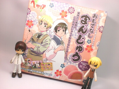 数日前、学ヘタゲームの予約を確認する時にアニメイトの通販ページを覗いたら、新商品の所に『おもてなしまんじゅう』なる物があったので即行予約しました。だって、パッケージが島国二人だったんですもの!そんな訳で、昨日発売日のおもてなしまんじゅうが届きました。ちなみにおまけとして、3種のシールがランダムでついてきます。今回は英日米仏バージョンでした。おまんじゅうは皮がピンクで、中身が桜餡というお花見をイメージしたものっぽいです。外見も大きさも可愛い♪さくら餅が食べられる人なら、おいしくいただけると思います。通販はすでにおとりよせ待ち状態なので、買うならアニメイトに直接行くしかないでしょう。さすがこのコンビは人気ありますね~♪ちなみに同日発売の日本特製うどんも買ったのですがこちらは調理しないと食べられないので、後日感想を書く事にします。