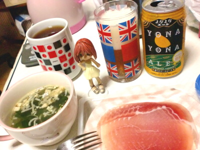 昨日で私の夏休みは終わり、今日から普通にお仕事です。一日仕事しただけなのに、すでに疲労困憊なのは、きっと久しぶりに長時間冷房に当たっていたからでしょうね。今夜は家族がお出かけで、一人晩御飯だったので今日はモスバーガーにでもしようと思ったのですが、一度家に帰ってきたら出かけるのが億劫になってしまいました。そんな訳で、あり合わせの物をかき集めてみました。乾燥スープ、生ハム、ルイボスティー、そしてエール!あまり食欲もなかったので、丁度良かったです。ところでエールビールという物を初めて飲んでみたのですが、思ったよりも飲みやすく美味しかったのですっかり気に入ってしまいました。フルーツビールなど、ちょっと甘めのビールが好きな人にお勧め!!