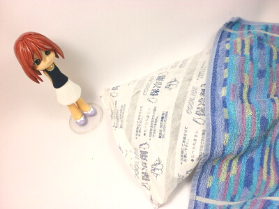 また暑い日が続くようになってきました。でも私の部屋にはクーラーは無いし、部屋でしか出来ない事もたくさんあります。そこで大活躍しているのは、ケーキなどを買った時に付けてもらった保冷剤です!小さいものはマフラータオルにくるんで、そのまま首筋にまいてタオルの両端をゴムで固定。大きいものはフェイスタオルでくるんで、火照った足を乗せて冷やします。血の流れる元を冷やすせいか、室温が30℃を超えていても結構これで大丈夫なんですよね。こんな事なら昨日や一昨日も使えばよかったなぁ。いつか使うだろうと取っておいた保冷剤、ものすごく役に立ってくれたので、捨てないでよかったです!