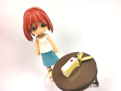 またもやリプトンのレモンティーさんがスイーツのオマケを付けてくれました。ジュエリースイーツコレクション全8種で、私が今回買ったのは『チョコケーキ』です…が。思いっきり表面白いのは、ホワイトチョコだからでしょうかね?今までのスイーツコレクションと比べると、明らかに小さいのですが、個人的にこちらの方が扱いやすいと思います。何しろ小さいので、保管場所をとらないし携帯等に付けても、邪魔にならない(笑)でも、金属を使用しているせいか、ちょっと重いです。持って見ると大きさの割りにずっしりきます。ちょうどピンキーのスイーツサイズなので、並べるとすごくしっくり馴染んでいます。すばらしい!ただ、ジュエリーを使っているので、リアルさには欠けるのがちょっと残念です。