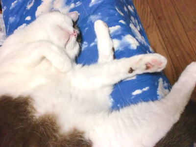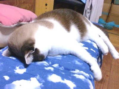 数日前から騒がれている台風15号が、とうとう関東にやってきました。私は雨風ですぐ止まるという評判の私鉄通勤なので2時過ぎに帰ってもよろしいとのお達しが出たのです。そこで3時頃に会社を出て、家に帰ってきたのですがすでに雨がひどくて、帰宅直後風呂に入りました。その間にも雨風が凄くて、ちょっとビクビクしながら入浴。隙間から風が入ってくるんですよ!とりあえず現在午後6時半過ぎ、大分雨風は収まっています。このまま台風一過かな?写真はそんな台風の中、爆睡している空ちゃん。本当に家猫でよかったね!