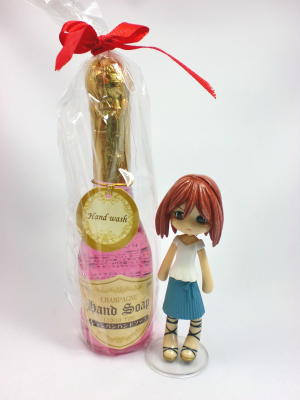 昨日のイベントで本をまとめて購入したら、ノベルティとして(ん?オマケかな)シャンパンハンドソープという物をいただきました!一瞬本物のミニシャンパンボトルかと思って、びっくりしましたが、瓶の口についている丸いタグの裏に大きく「のめません!本品はせっけんです」と書いてあってちょっとがっかりしたのは内緒の話(笑)まぁ、未成年の方もたくさん参加する場所なので当然お酒など配るはずはないのです。開封して香りを堪能してみたいけど、何か開けるのがもったいないので、しばらくこのままだと思います。本当にせっけんで困った時に開ける事にします(笑)