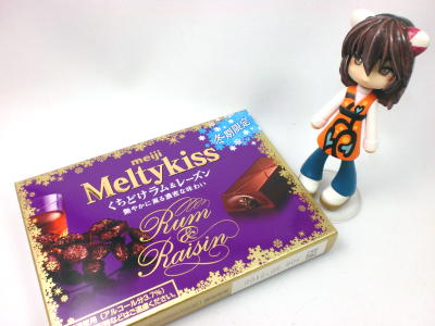またこのチョコレートが販売される季節になりました!チョコの中ではこのMeltykissシリーズが一番好きかもしれません。今日買って来たのはくちどけラム&レーズンです。アルコールが3.7%と、缶チューハイ並みの濃度で入っているので、アルコールに弱い方にはお勧めしません。パッケージの隅っこにも「お子様や運転時などは御遠慮下さい」と書いてあるのですが、もっと目立つように書いたほうがいいんじゃないかなぁ…。まぁ、私自身は子供でもないし、運転もしないので余裕でOKなのです。大人万歳(笑)さっそく明日、おやつに食べようと思います。