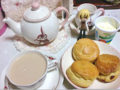 先日届いたスコーンとクロテッドクリームで、一人アフタヌーンティーをしてみました(笑)本当は生クリームとジャムを買ってきて、スコーンに添えたかったのですが、雨が降ったり止んだりで出かけるのが面倒になってしまったのです。でもクロテッドクリームだけでも大変おいしくいただけました!本当にスコーンって紅茶によく合いますね~。まだスコーンもクリームも残っているので、明日もアフタヌーンティーをしたいと思います♪