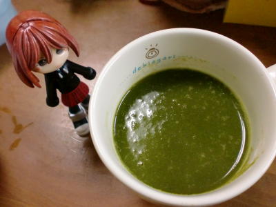 想像以上に体力が落ちていたので、スープメーカーを使って緑黄色野菜のスープを作ってみました。材料は残り物のほうれん草のおひたし・ゆでブロッコリー、そして冷蔵庫にあったニンジンです。それらを約1センチの角切りにし、水とスープの素と一緒にスープメーカーに入れてスイッチを押すだけ!約30分後に出来たのは、想像以上に緑色のスープでした。色はちょっとびっくりでしたが、味は今まで作ったスープの中で一番おいしかったのです。多分、ほうれん草のおひたしにすでに味が付いていたのとそれに鰹節がかかっていたので、更に出汁が出たからかもしれません。なので、醤油と鰹節が入っている為、ちょっと和風な味になりました。生クリームをちょっと垂らそうかと思ったのですが、やめておいて正解(笑)普通のスープに飽きた人にほうれん草のおひたしスープ、お勧めです!!