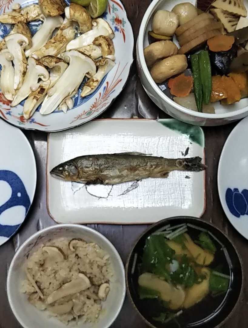 松茸ご飯に松茸のお吸い物、焼き松茸、鮎の塩焼き(小ぶりです)に煮物です。