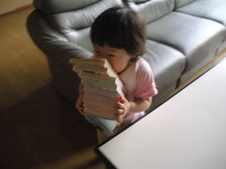 7冊重ねて持ち運ぶのに成功し「やったね!」と私が声を