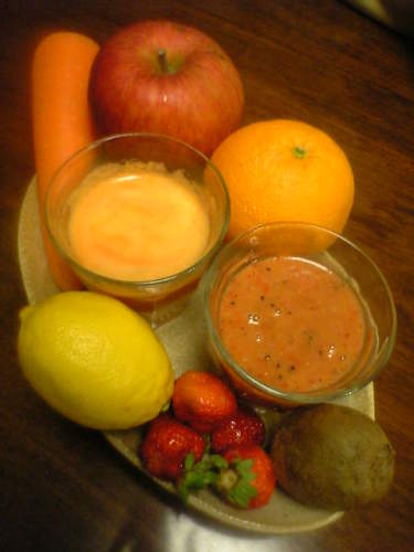 今週は寒くなりそうです。どうぞ空気も乾燥していますので、うがい手洗いを。だんだんと朝から寒くなると生のジュースはちょっとね・・と思われていませんか?そこで!何かを入れれば生のジュースも飲んだそばからぽかぽかになります。それは、ひとかけの「生姜」です!生姜を入れれば、ぴりっとしますが、ぽっかぽかです(*^^)冬でもホットな生ジュースの作り方<手前にあるジュース。生姜、いちご、キウイ、オレンジ>オレンジはしぼって・・後は、いちご、キウイ 生姜汁と一緒にミキサー。生姜は好みで、すりおろした後に入れても。口あたりは、どろっとしています。生姜汁は少しだけでしたが、体が、ポッカポカ です。体の中からジワーっときますよ! キウイは苦味がでるので(種から)最後にミキサーに入れてちょっとだけまわすのがおすすめです。<奥のジュース。にんじんとりんごとレモン そして生姜を少々>にんじん、りんご、レモンの絞り汁。にんじんとりんごはジューサーにかけました。すっきりと美味しいですよ。生姜の効果でポカポカに!ジュースのレシピは日ごろ、皆さんが作っていらっしゃるベースにちょっと生姜をプラスするだけで、飲んだそばからぽかぽかになります(^^)生姜の効果は生姜は古くから、さまざまな漢方薬の素材として取り入れられてきました。現在も、病院や クリニックで処方される漢方薬のうち、7割以上に「生姜」「乾姜」とよばれる生姜が配合されて いるそうです。体を温めて冷えを取り除く作用と、体内の余分な水分を取り除く作用 を期待しています。 生姜によって体を温まると、体全体の臓器の働きもよくなり、 たまっていた体の余分な水分が排出されます。生姜の入ったものを飲めば、からだがぽかぽかしてきます。 血行がよくなり、新陳代謝が促され、尿や便を促して、体の中がきれいになりますよ。生姜は、腸管の働きをよくします。食べ物の消化をよくし、腸にたまったガスを 排出させたりします。独特の辛味と香りの成分は、すぐれた薬効を持っています。辛味の成分は、ジンゲロンとショウガオールで、独特な香りはシネオール、ジンンギロベールなど の精油成分です。これらの成分は、唾液の分泌をよくして食欲増進や発汗作用保湿作用があるで、 風邪の初期にぴったりです。(生姜は、胃を刺激すますので、胃があれやすい人は、摂りすぎに注意しましょう)生姜は、抗菌作用、抗炎症作用がありますから、のどの痛みや咳を鎮めたり熱を下げたり という作用もあります。風邪予防や、風邪のときには、生姜をジュースに・・・ちょっとすり下ろして加えるだけでポカポカに(*^^) 今、話題の加熱もできるミキサー!そのまま煮ることもできスープができますよ!ブレンダー/加熱調理/ミキサー/ジューサー/グリーンスムージー/テレビ/紹介/テレビショッピング...価格:24,800円(税込、送料込)いつも ご訪問ありがとうございます。 (*^^)*れもんずカフェのメニューは右サイドの『カテゴリー』からお選びください。右サイドの 『キーワードサーチ』から「頭痛」とか野菜の名前「にんじん」など「気になる言葉」 を、ブログ内にチェックをいれて検索してみてください。。お探しのメニューが見つかるかもしれません。。また、トップページからも ご案内しております。。