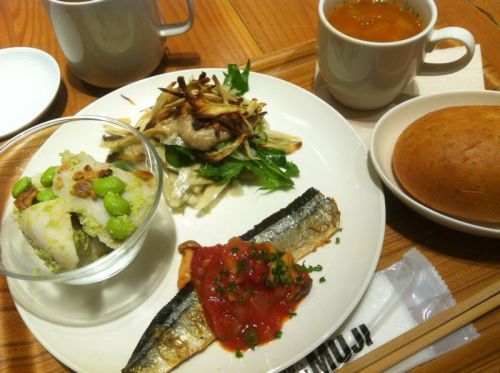 自然な美味しいメニューばかりで私は無印のカフェは大好きです(*^^)1人でゆっくりしたい時にもお友達とも、もちろんご家族でも♪メニューはさんまのトマトソースかけ。 魚料理にもトマト料理はあいます枝豆と里芋の煮物 とても薄味でした。素材を楽しめます。サラダはごぼうがきいてました!ちょっと乾燥したごぼうも生のごぼうも!それからミネストローネのスープ♪パンは全粉パン 雑穀米のおにぎりにもできます。食べた後は、無印のスープやカレーを買って、離れて暮らすわが子たちへ送ることに。今から年末が楽しみです~♪早く帰っておいでね~♪いつも ご訪問ありがとうございます。 (*^^)*れもんずカフェのメニューは右サイドの『カテゴリー』からお選びください。右サイドの 『キーワードサーチ』から「頭痛」とか野菜の名前「にんじん」など「気になる言葉」 を、ブログ内にチェックをいれて検索してみてください。。お探しのメニューが見つかるかもしれません。。また、トップページからも ご案内しております。。
