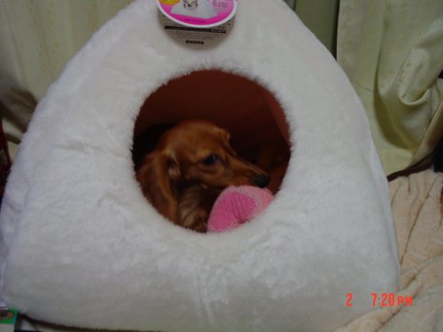ほとんどのお店が元旦初売りの青森(^^;その中でも、2日が初売りのホームセンターの初売りに昨日また懲りずに勇んで出発ここのホームセンター、かふぇおれがいたペットショップ併設で普段は非常に空いているので(苦笑)9時半開店というけどそんな人がいるわけがないと余裕こいて開店10分前に行ってみたら大行列(o_ _)oバタッこの日の目玉、2007円福箱はすでに整理券がなくなり買えずワンコ福袋1000円を買おうと違う列に並んだ旦那とかふぇおれ30個くらい?あったワンコ福袋、5分ほどで完売(゚0゚;)すごいでかい袋に入ってましたが、あけてみたらかまくら型のふわふわ素材のハウスとサマーヤーンで編んだピッピッと鳴るハート型おもちゃが入っていたので、その中で必至に遊ぶかふぇおれでした(^^;そのほかにも、フードボール、ランチョンマット、トイレシート1袋ドッグフードのサンプル2個、ブラシが入ってて・・多分、元値6000円くらいはするのではないかという・・すごいいい福袋♪元旦に行ったホームセンターの2000円福袋の10倍もいいです(爆)さっきのかまくらハウスの中で、楽しく遊んでいるかふぇおれを撮ろうと思ったら、急に顔を出してきたので変な写真に(爆)