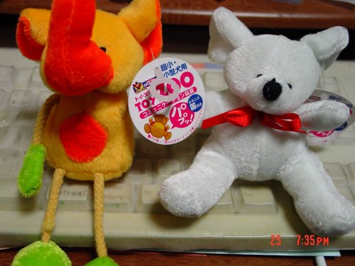 今朝のブログにも書いたとおり、今日はかふぇおれの誕生日朝にミスドを食ってたのでケーキは無しという事で(爆)2歳になったおねぇちゃんに、誕生日プレゼントを買ってみました♪噛むとピッピッと音の鳴るおもちゃです♪帰宅して「おかえり~~~~わあい\(^▽^\)(/^▽^)/わあいっ」と興奮中のかふぇおれに袋に入れた状態で渡したところ・・・一生懸命袋を破いてました(^^;ところが、開けてみたらがっかりしていたお嬢さんどうも・・・おいしいのじゃないっという反応(苦笑)でも晩御飯を食べて落ち着いたら、喜んで遊んでました♪オレンジのやつのほうが気に入ったようです(^^;白いのは一瞬噛むけど、すぐ止めちゃうんです・・・・理由を考えたんですが・・・もしかしてトロと勘違いしてる?うちではトロのぬいぐるみは噛み噛み禁止と教えていて同じ白で、大きさも微妙なラインなためダメだと思ってるのかも?ちょっと色の選択失敗したか~~??(爆)