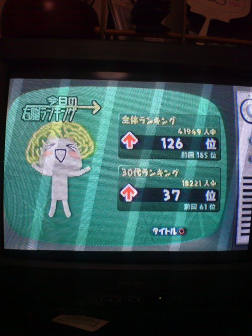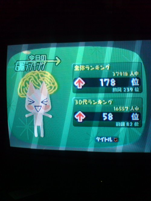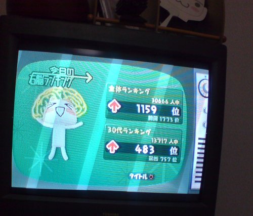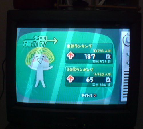 夕方やったら、過去最高記録でした♪なにせ普通のブラウン管テレビ@93年製の画面を写したもんで画像悪いんですがm(__)m全 体:30666人中1159位♪30代:13717人中 483位♪♪ん~~、全体ランキングで1000位切れるようになりたいっ