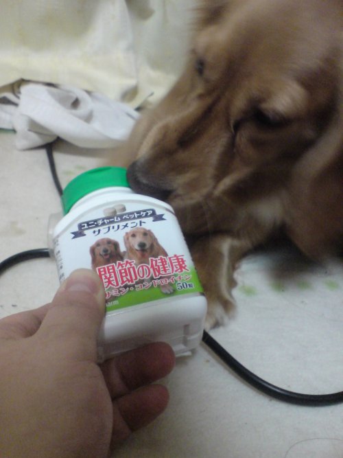 もうすぐ2歳の誕生日が来るかふぇおれですが・・1歳になるまでは、あちこち怪我とか出物とかばっかりで動物病院に何度も行きましたどうぶつ保険に入っててほんと良かったと思います、ええ1歳過ぎてからは、出物も怪我も無くて助かってます(^^;ところで、生後6ヶ月の頃・・リビングで一人遊んでいたお嬢。特に何も無いところで遊んでいたのに、突然キャンキャンキャン!!と左手を床に接地できない状態で鳴いてて・・夜9時頃だったのですが、病院に電話して連れて行ったら人間で言うところの「肩関節亜脱臼」 整復してなんとか元に戻ったんですが、その後2度ほどまた同じ症状が出て、その度旦那が治してました(爆)(おめ~じゃ、ね~~のかいヾ(ーー;)ォィというつっこみは無しでよろしく)どうもσ(^^)に似て関節が弱いようなのでサプリを飲ませ始めました(苦笑)それがこれすぐに手に入るのがユニチャームのしかなかったのでこれをあげてるんですが、大変お気に入りのようです(^^;食べ始めてからは亜脱臼もなく、毎朝1粒喜んで食べてます♪試供品でもらったファンケルのやつもあるんですが、こちらはお気に召さないようで、あげても( ゜ 3゜)≡@ ペッ!!と出しちゃいますもったいないから我慢してこっちも食ってくれ~~と思う親心は通じないようです(p_q)エーン