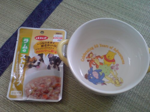 σ(^^)が風邪引きさんなもので、かふぇおれにご飯を作ることができず・・・ここ数日買い置きしていたものをあげています(^^;以前、モニターで当たったことのあるラムのストロガノフです♪旦那がゲーセンで取ったプーさんの器に入れてお出しします(笑)すごくおいしいようで、ほんとうに大好きです(^^;ホームセンターに行ったときに、非常食としてまとめ買いしてます(苦笑)喜んで食べてくれるので助かってます(^^;